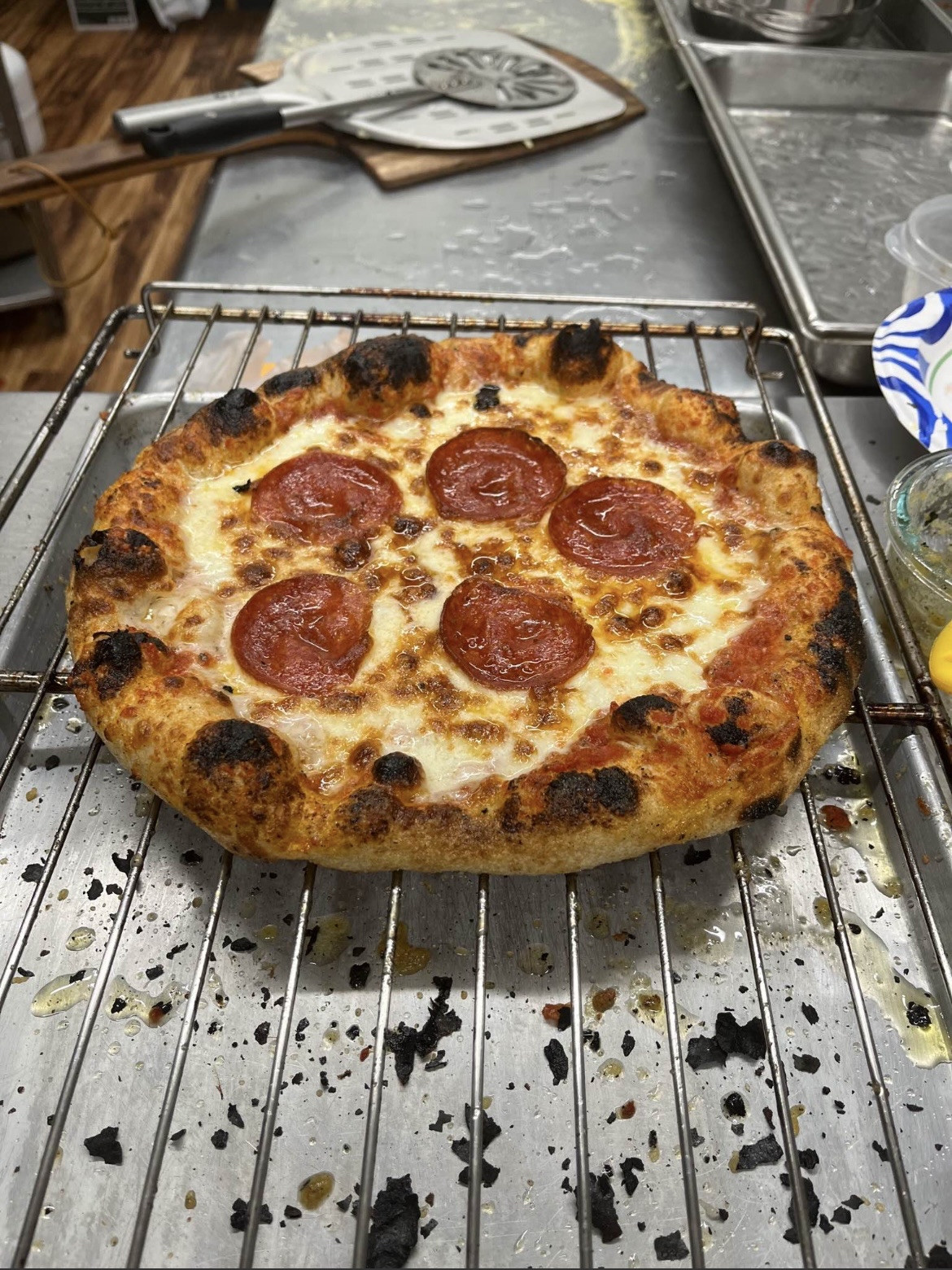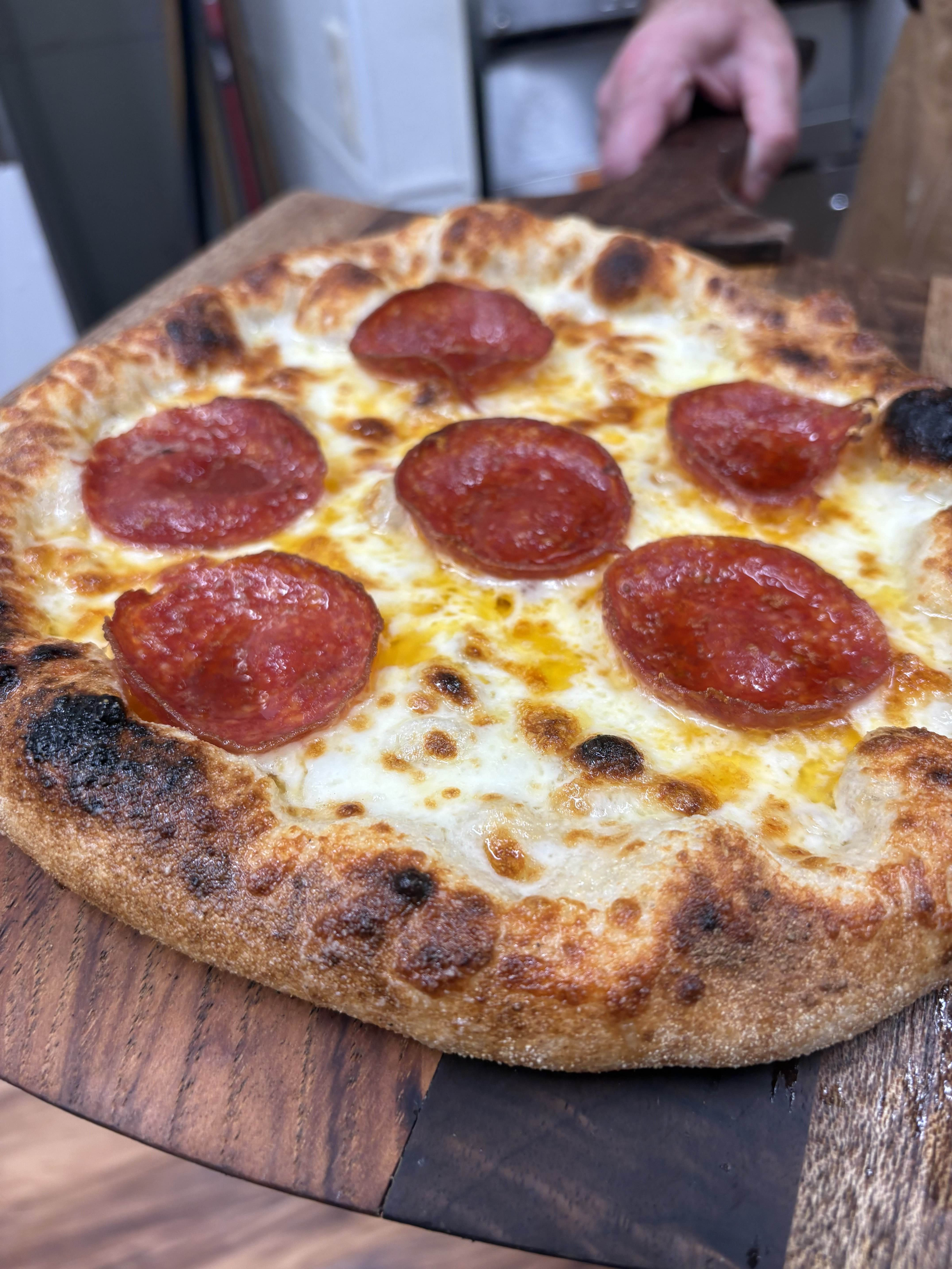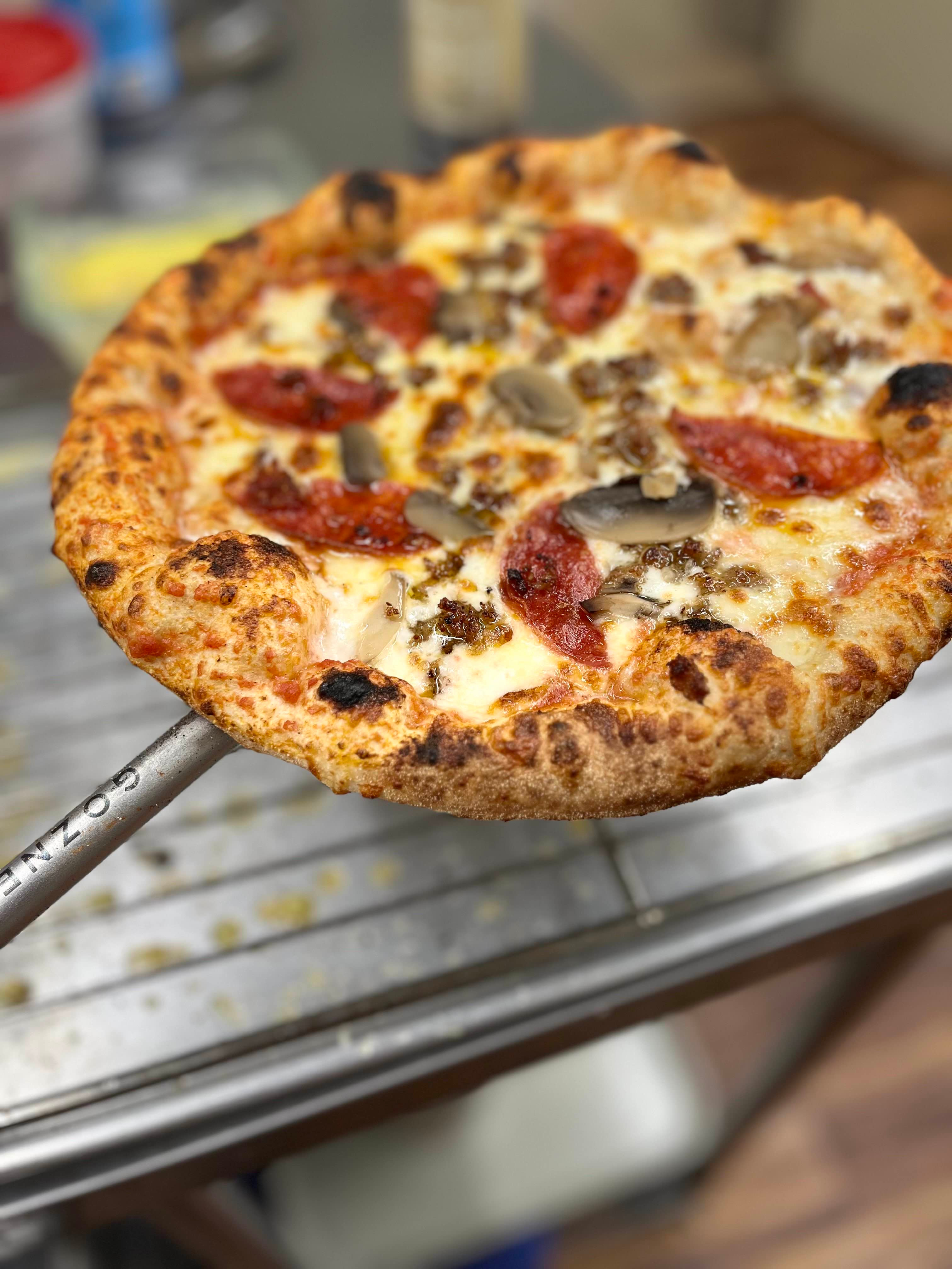 Our pizza is Neapolitan style cooked in a high heat oven. The crust will have the traditional leopard spots which are a hallmark of authentic Italian pizza. Every pizza is made using a French poolish technique which makes a light, chewy, and highly digestible dough. The dough is made from the highest quality flours including house milled Heritage Red Turkey Wheat sourced locally. The dough is fermented and takes a minimum of 24 hours to produce.